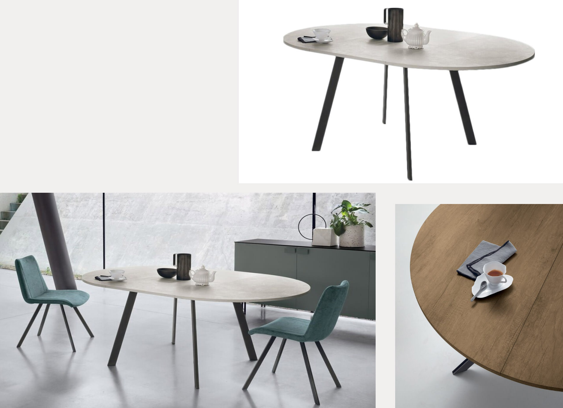 Come avrete visto dalle immagini pubblicate , il sistema di allungamento non preclude l’utilizzo dei materiali , infatti avremo piano tavoli in vetro, legno, laccato, laminato e ceramica con le relative strutture in legno, metallo, laccate.