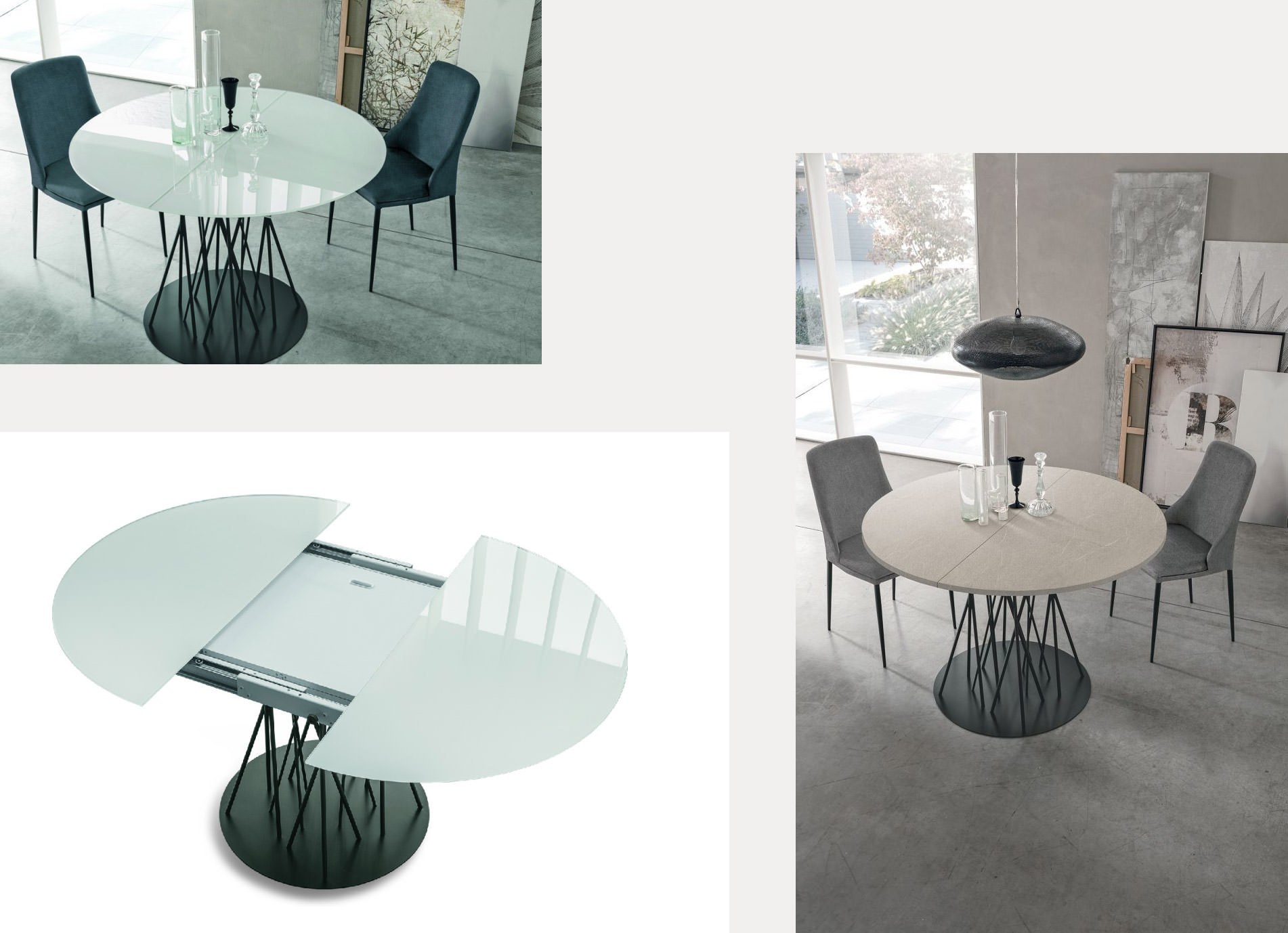 Nel primo caso si avranno due prolunghe che escono da destra e sinistra del tavolo e il basamento strutturale rimane nella stessa posizione, nel secondo caso una o più prolunghe allungano il tavolo e telescopicamente la struttura si sposta portando all’estremità le gambe del tavolo